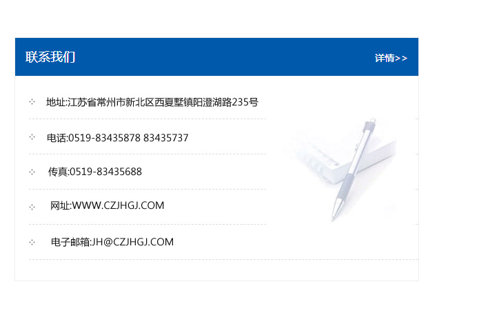 地址:常州市新北區友邦商務大廈1幢16、17層  電話:0519-85101652  傳真:0519-85112595  郵編:213022  網址:www.cz-jiayue_cn.albertel.com  郵箱:xiajifengaa@163.com
